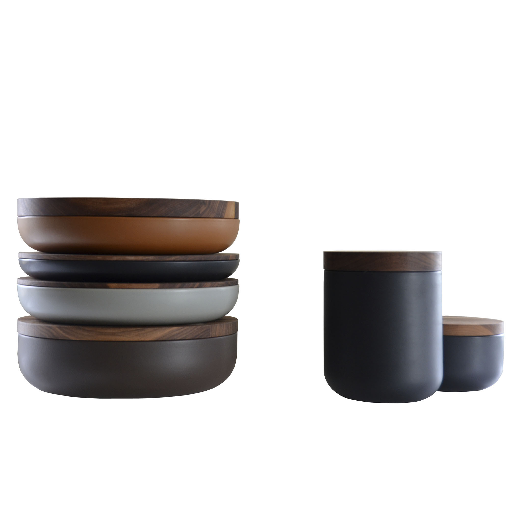 Each piece was initially composed of two elements: an earthenware container and a wooden plate. While the angle of the curve and the smooth profile of each pot are fixed, the diameter and height of the vessels vary, these shifts in scale determining whether the container framed is a bowl or a platter. The thickness of the wooden plate, which serves as both cover and plinth, is also variable.