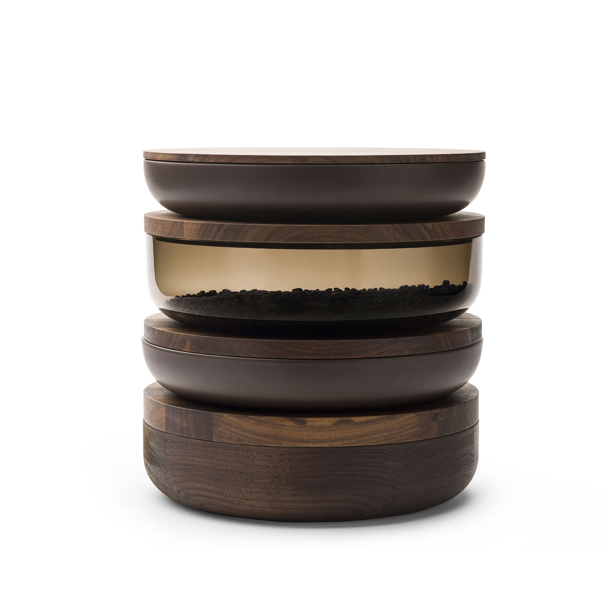 Each piece was initially composed of two elements: an earthenware container and a wooden plate. While the angle of the curve and the smooth profile of each pot are fixed, the diameter and height of the vessels vary, these shifts in scale determining whether the container framed is a bowl or a platter. The thickness of the wooden plate, which serves as both cover and plinth, is also variable.