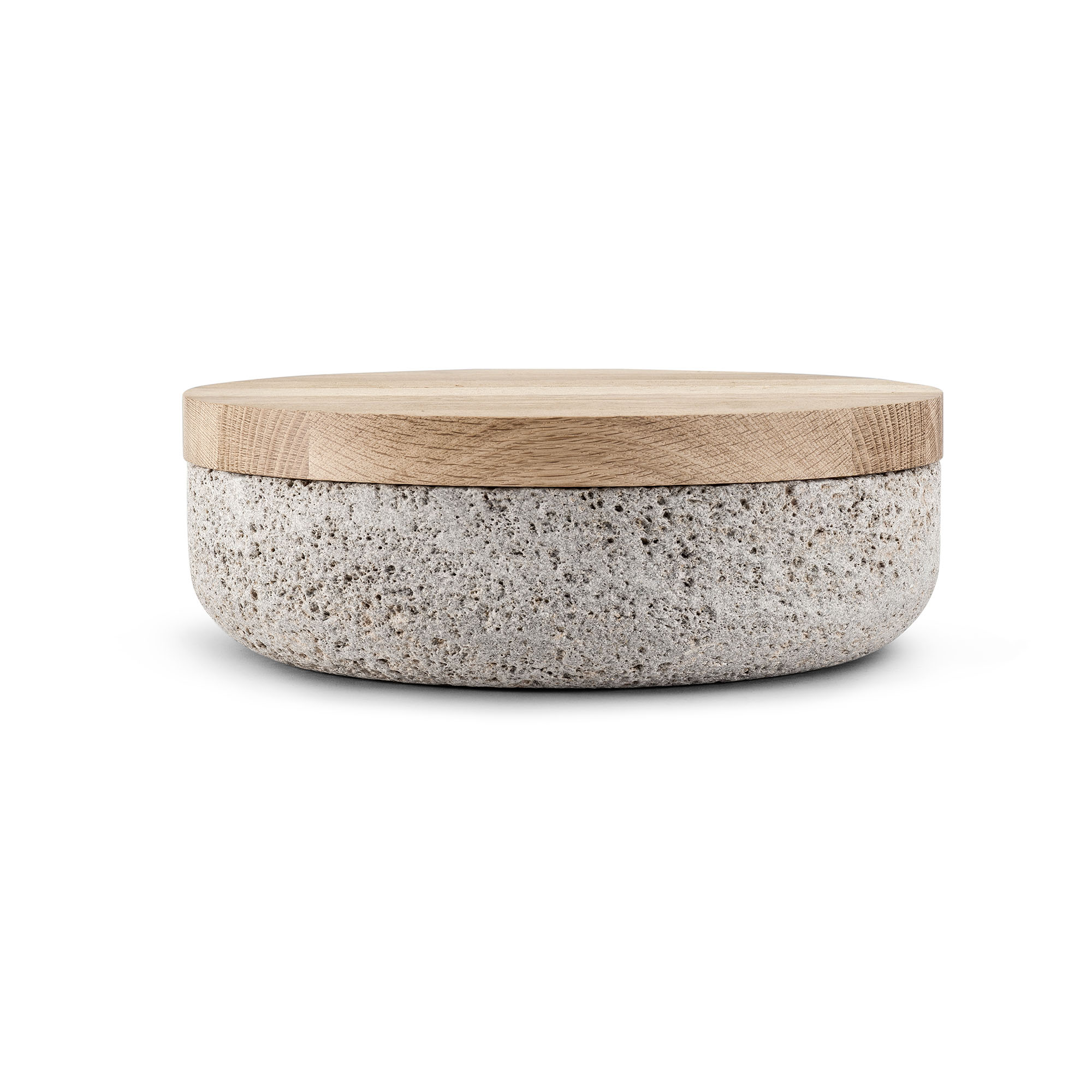 Each piece was initially composed of two elements: an earthenware container and a wooden plate. While the angle of the curve and the smooth profile of each pot are fixed, the diameter and height of the vessels vary, these shifts in scale determining whether the container framed is a bowl or a platter. The thickness of the wooden plate, which serves as both cover and plinth, is also variable.